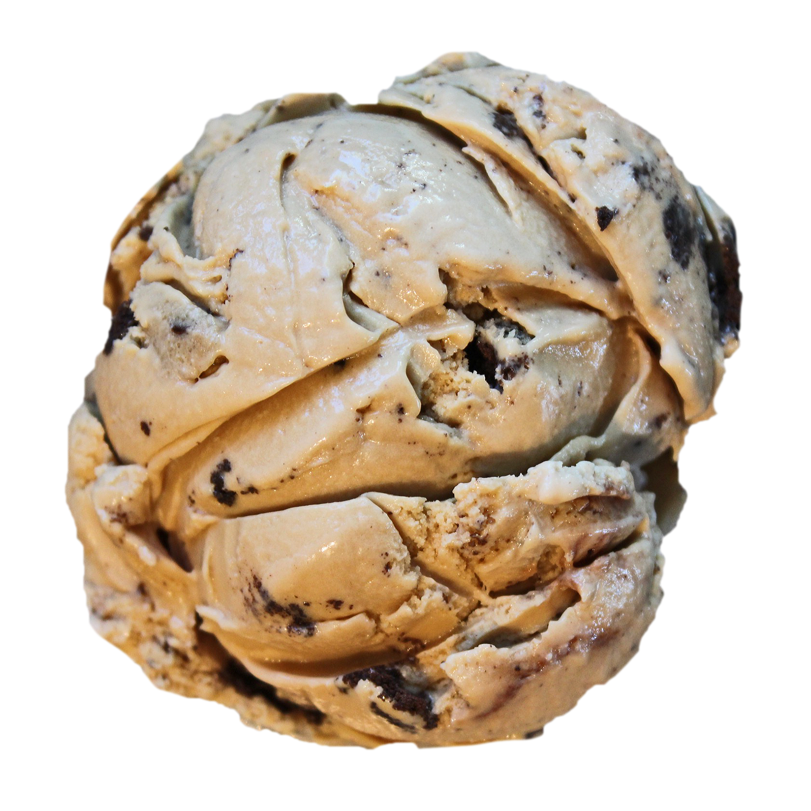 Coffee ice cream with brownie pieces, chopped almonds and fudge swirls
